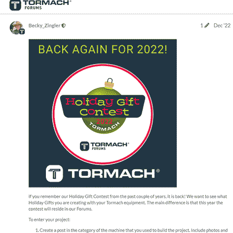 I implemented a holiday gift-making contest on our forum and followed through with social media – engaging customers to enter their projects – Visit page